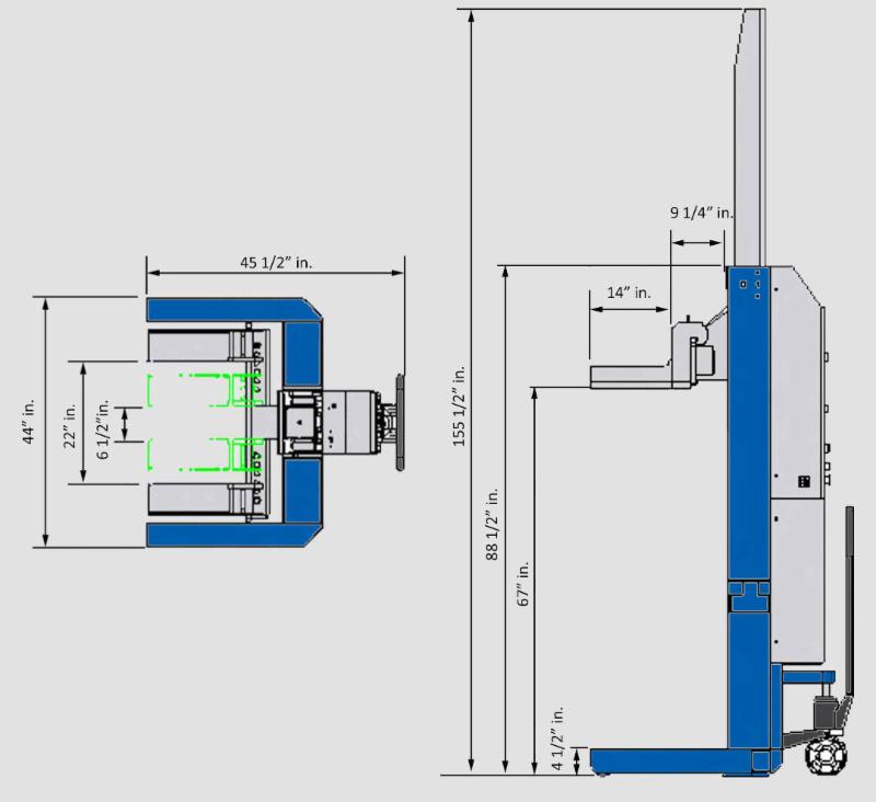 Specifications MSC-13K-B Capacity Per Column 13,200 lbs. Overall Height 88.5" Overall Width 44" Maximum Distance Between Columns 32'-8" Fork Length 14" Lifting/Lowering Time 75/60 sec Power Pack 24VDC/3HP Noise Level 70dB(A) Net Weight 1,210 lbs Per Column